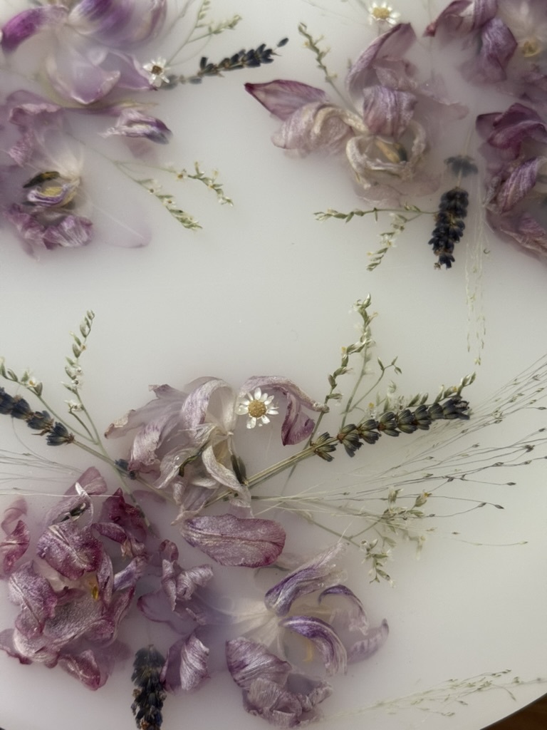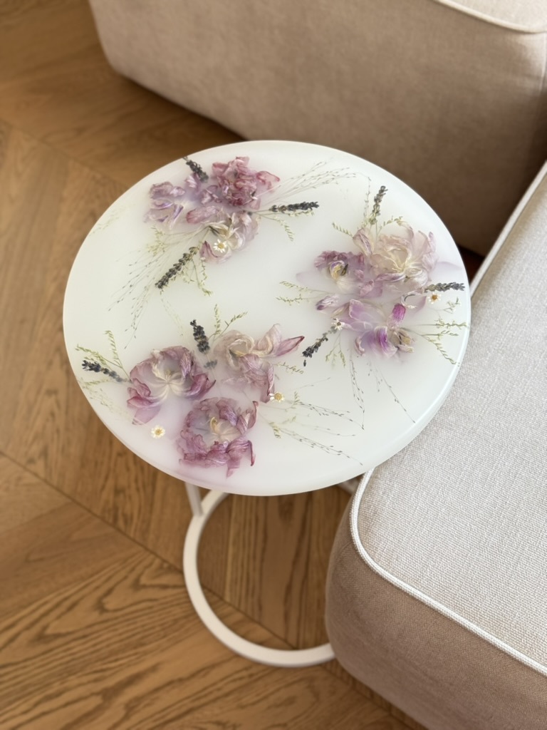Моя дочка с каждым днем становится все подвижнее и любознательнее, но это не мешает мне развиваться и творить. Я создаю уникальные столы, зеркала, шкатулки, подносы и даже ручки для мебели, все из эпоксидной смолы с сухоцветами. Все цветы я самостоятельно собираю, выбираю и сушу. Порой это даже целое путешествие для нашей семьи, чтобы я собрала цветы для будущего проекта. Самый интересный для меня опыт - это засушить одуванчик, чтобы он не разлетелся.